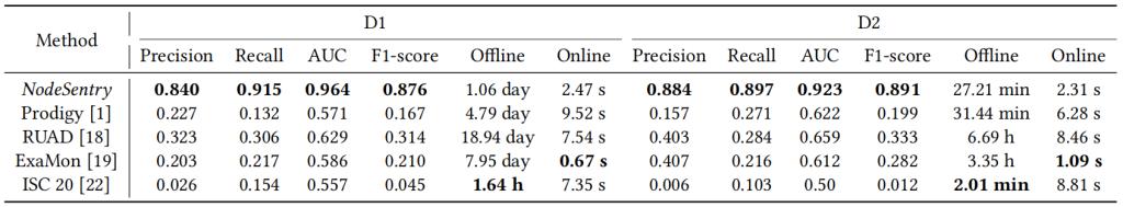为了验证NodeSentry的性能,实验结果表明NodeSentry在F1分数上达到了0.876和0.891,相较于现有的最佳基线方法分别提高了0.562和0.558,同时在训练开销上相较其他深度学习方法分别减少了77.93%和13.45%。这些结果表明,NodeSentry在异常检测的准确性和效率方面都具有显著的优势。为了验证NodeSentry中各个关键组件的有效性。实验结果表明每个组件都对NodeSentry的性能提升做出了重要贡献。