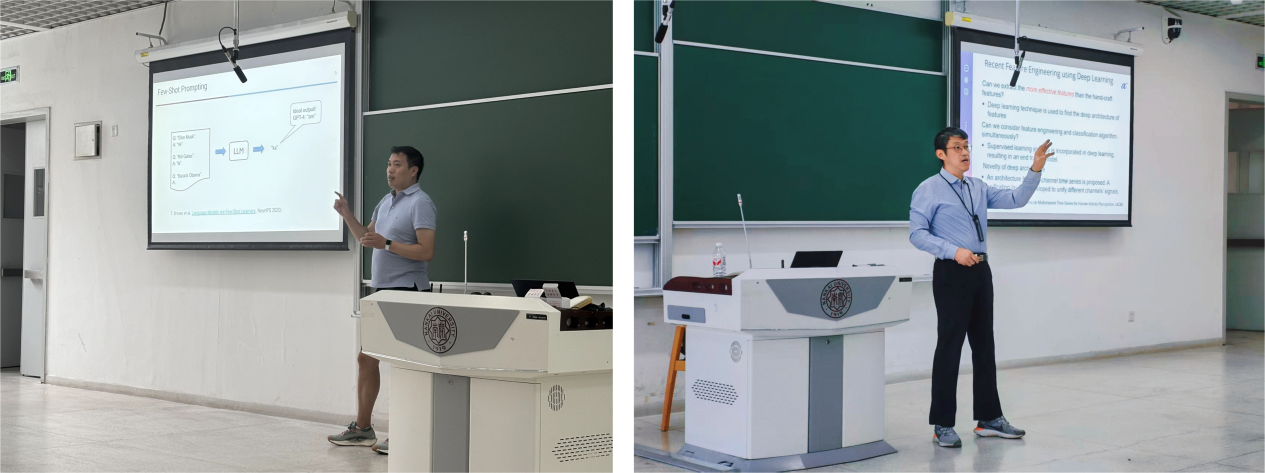 韩玫老师带领学生深入探索了多模态大语言模型,系统讲解了图文对齐、跨模态注意力机制、预训练策略等关键技术,并结合图像生成、视觉问答、医疗辅助等典型应用场景,全面提升学生对语言、图像与语音等多模态信息融合的理解与工程能力。王奥森老师侧重于通用大模型的社会融合路径,讲解了其在医疗、教育、金融、工业等领域的应用现状,并探讨了人工智能对职业角色、伦理边界与未来协作模式的深远影响,引导学生建立了对“人机共生”未来社会形态的理性认知。李晓黎老师聚焦于传感器驱动的时间序列分析,介绍了人工智能在传统制造、航空航天和医疗等领域的前沿应用,包括自监督学习、跨域适应和模型压缩等关键技术,帮助学生学习构建具备高效部署与泛化能力的智能分析系统。课堂氛围活跃,学术交流热烈。