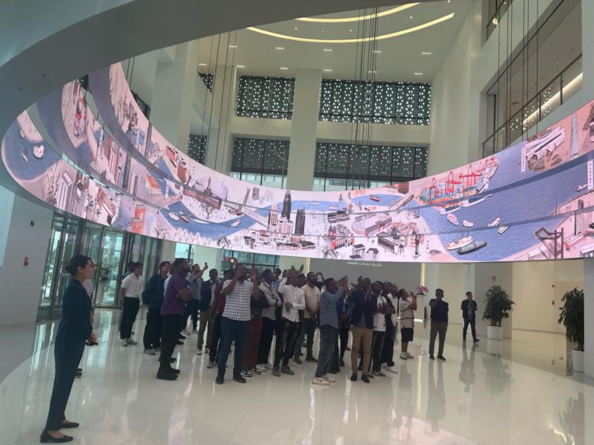 联想天津未来中心是联想集团在天津智慧创新服务产业园内设立的科技展示馆,展馆总面积6900平方米。留学生们首先在展馆一层观看了巨幅环绕式屏幕展现的数字文明艺术展,在地标的指引下,感受天津历史与现代、科技与文明的交融。