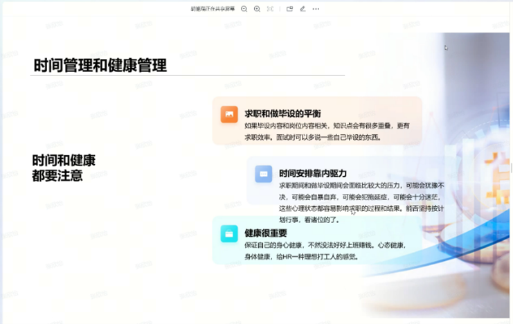 值得一提的是,校友们在分享中多次强调时间管理与健康管理的重要性。考虑到学生们当前正忙于毕业,他们建议同学们要合理平衡求职与学业,同时注重身心健康,以最佳状态迎接未来的挑战。